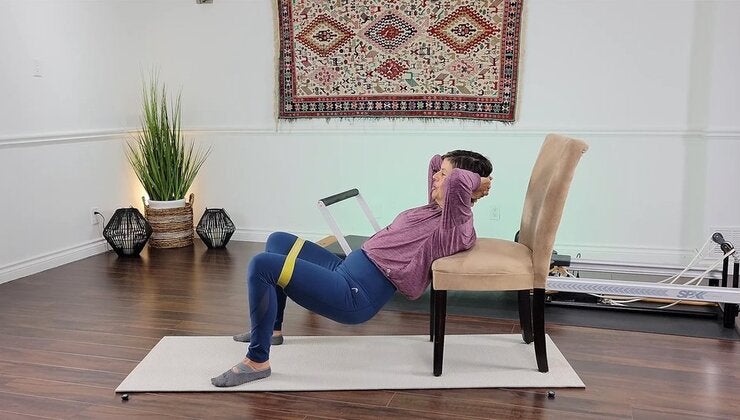 Chair-supported glute bridges with a Theraband to build strength in the glutes, back, and neck with added resistance.