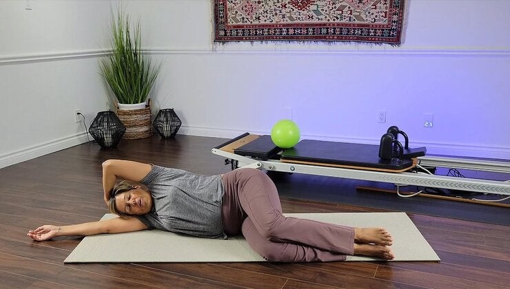 A trauma reflex practice combining side-lying diagonal curl with a thoracic twist to address asymmetrical tension.