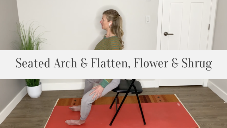 Seated versions of arch and flatten, flowering arch and curl, and shoulder shrug to reset habituated postural tension.